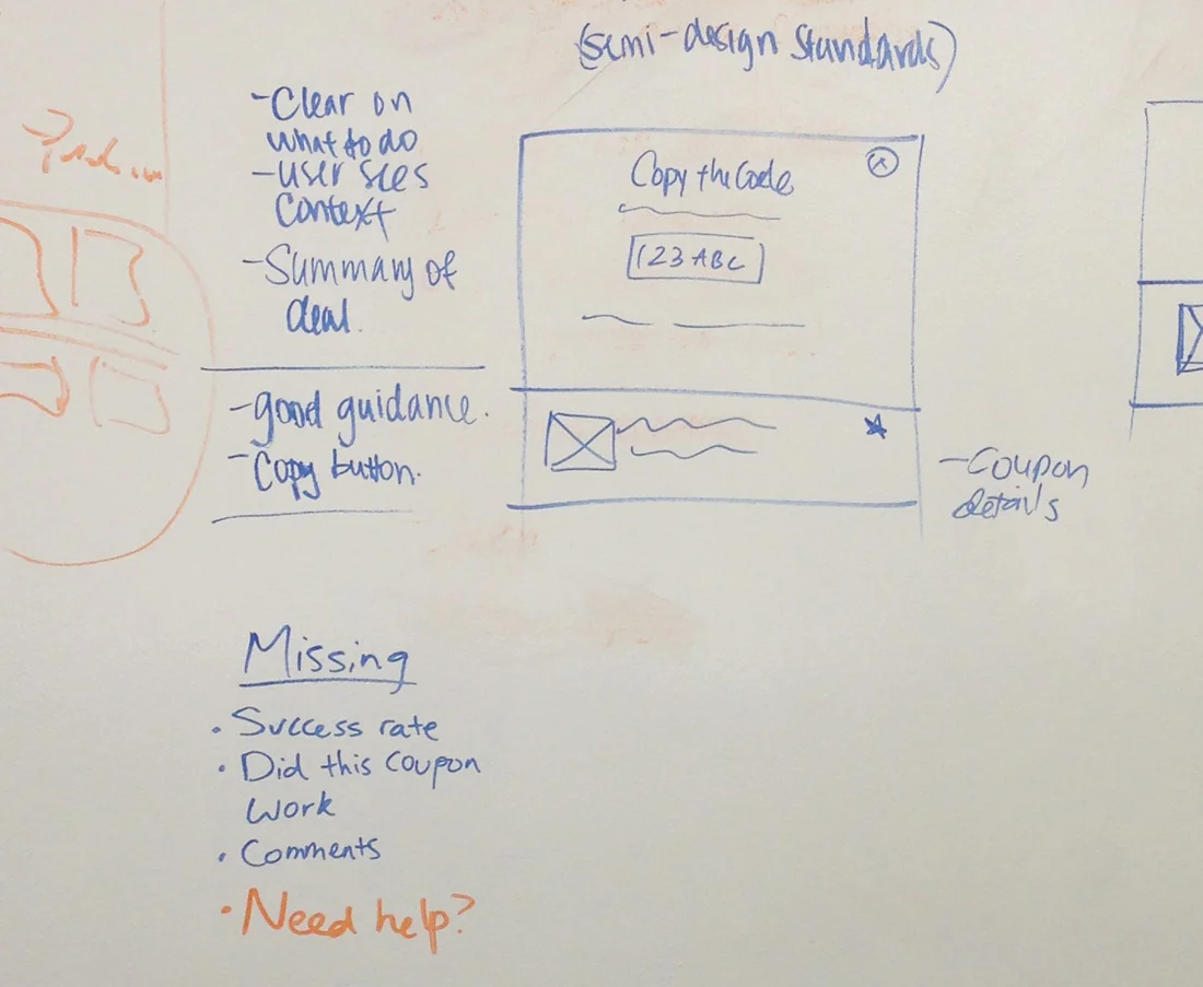 During this phase, we also worked with our product manager to brainstorm new elements to potentially include on the redesigned offer pages. With additional elements, we hoped to prolong a user's time spent on the RetailMeNot site, or get them to return post coupon redemption.